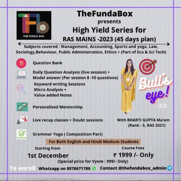 The RAS Mains exam comprises four papers, and it's common for candidates to overlook certain subjects during their Prelims preparation. Recognizing the significance of covering these "low-hanging fruits" with a high return on investment (ROI), our program has been meticulously designed to address these often neglected areas.